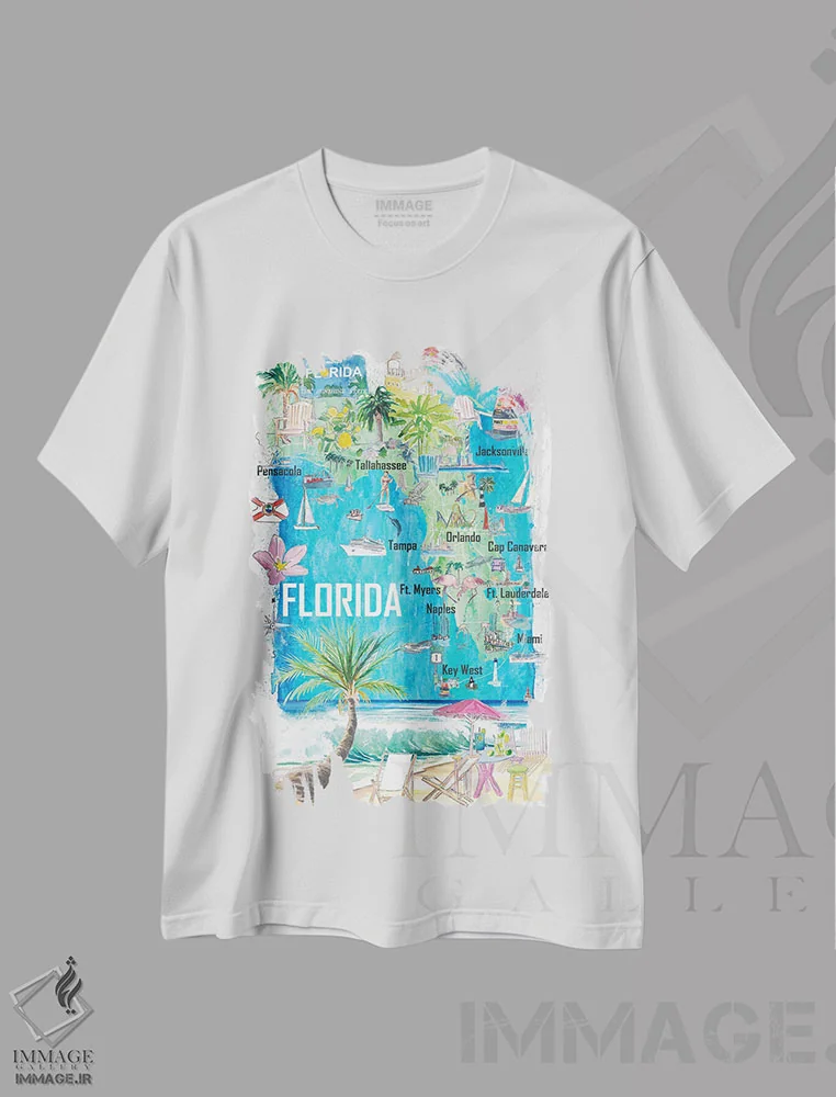 تیشرت سفید طرح دار – تیشرت هنری نقشه ,"نقشه مصور ایالت فلوریدا آمریکا با جاده ها و جاذبه های گردشگری" اثر مارکوس و مارتینا بلیشنر فروشگاه ایماژ تیشرت طرح هنری نقشه ,"نقشه مصور ایالت فلوریدا آمریکا با جاده ها و جاذبه های گردشگری" اثر مارکوس و مارتینا بلیشنر
