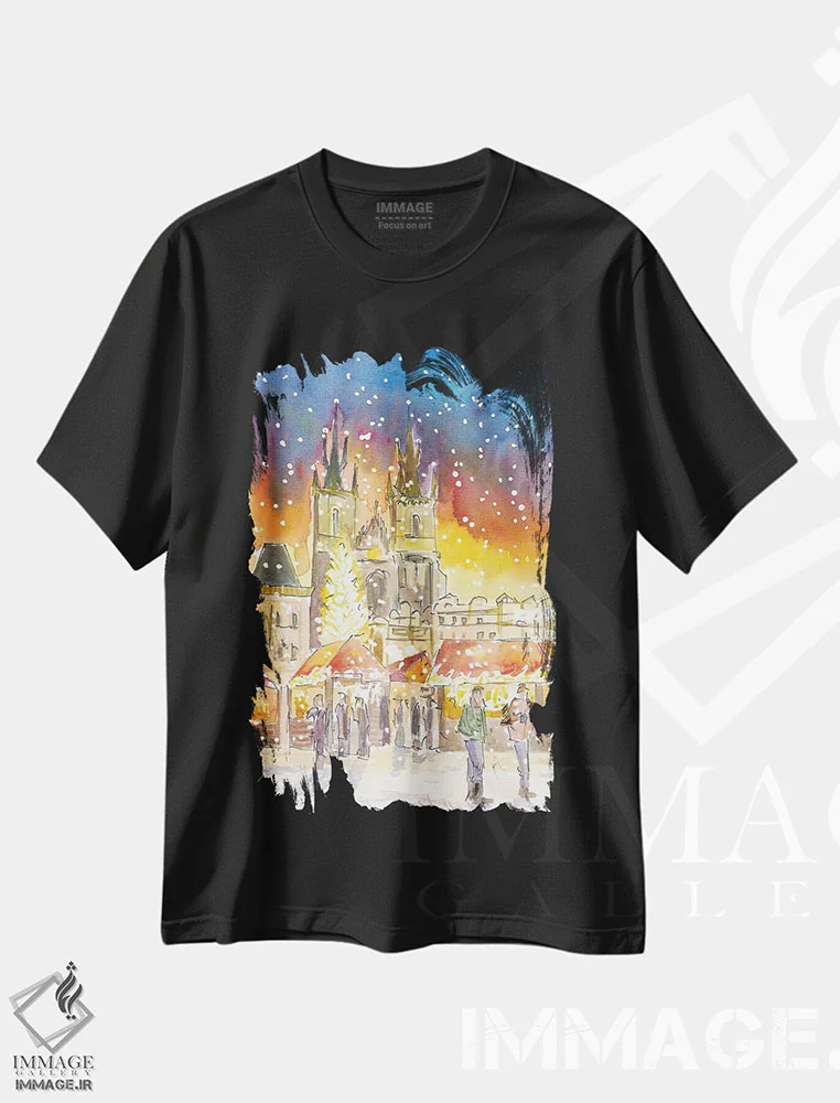 تیشرت مشکی طرح دار – تیشرت فصلی ,"میدان شهر قدیمی پراگ در زمستان و بازار کریسمس در شب" اثر مارکوس و مارتینا بلیشنر فروشگاه ایماژ تیشرت طرح فصلی ,"میدان شهر قدیمی پراگ در زمستان و بازار کریسمس در شب" اثر مارکوس و مارتینا بلیشنر
