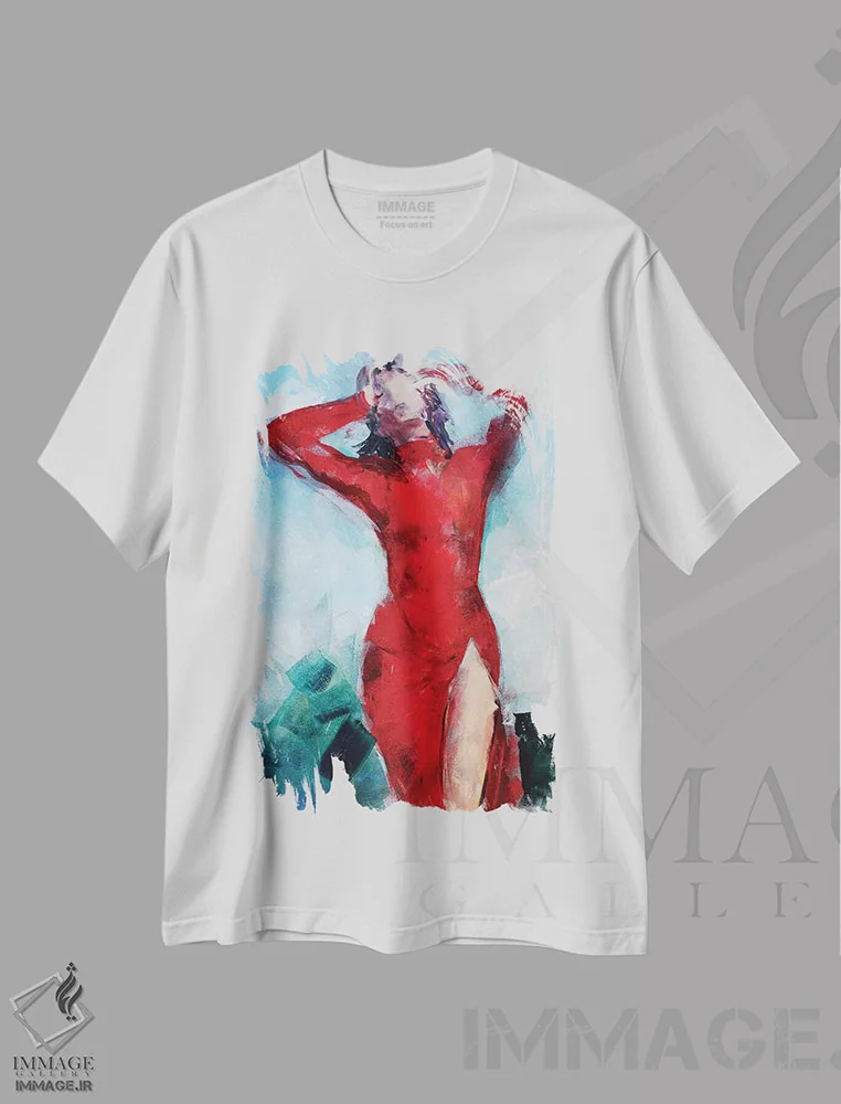 تیشرت سفید طرح دار – تیشرت هنری ,زن با لباس قرمز اثر مارینا دل پوزو فروشگاه ایماژ