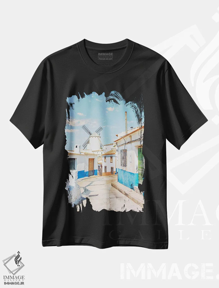 تیشرت مشکی طرح دار آسیاب بادی در اسپانیا، مدیوم اثر مانجیک پیکچرز | فروشگاه ایماژ تیشرت طرح دار آسیاب بادی در اسپانیا اثر مانجیک پیکچرز