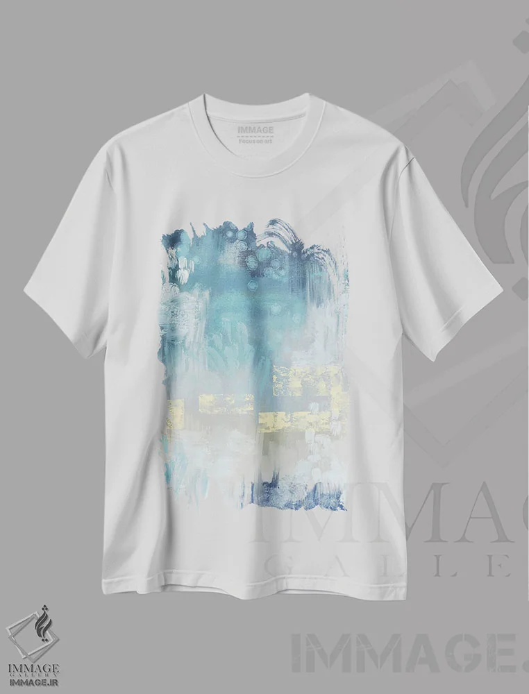 تیشرت سفید طرح دار – تیشرت آبستره ,آبی انتزاعی اثر میا چارّو فروشگاه ایماژ تیشرت طرح آبستره ,آبی انتزاعی اثر میا چارّو