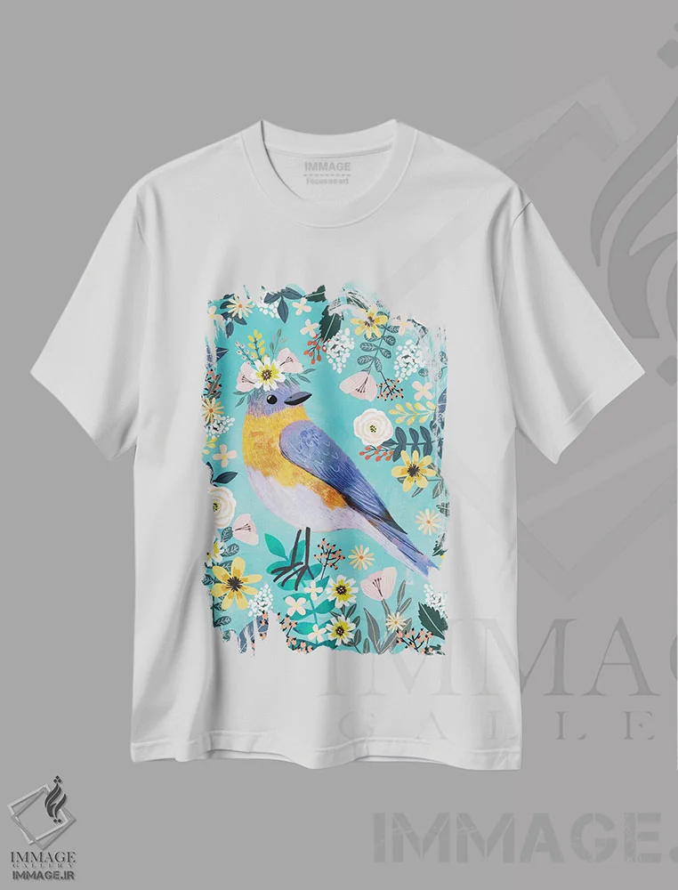 تیشرت سفید طرح دار – تیشرت طبیعت ,پرندهٔ آبی اثر میا چارّو فروشگاه ایماژ تیشرت طرح طبیعت ,پرندهٔ آبی اثر میا چارّو