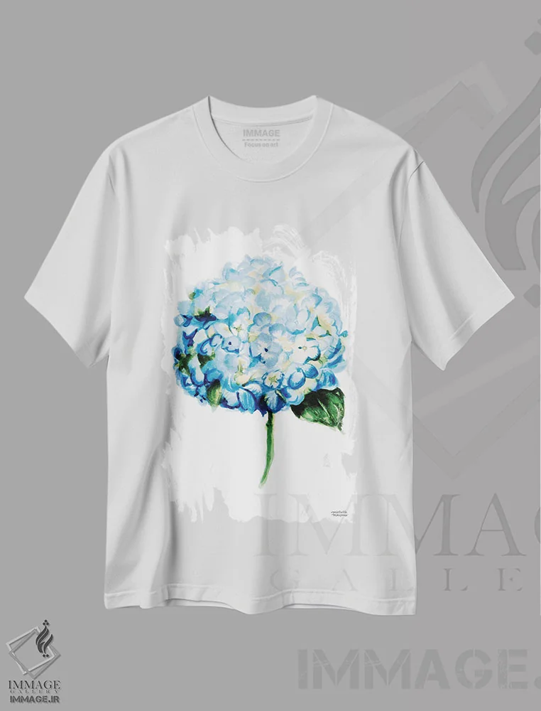 تیشرت سفید طرح دار – تیشرت آبرنگی هنری ,هیدرانژای آبی آبرنگ اثر میشل موسپنس فروشگاه ایماژ تیشرت طرح آبرنگی هنری ,هیدرانژای آبی آبرنگ اثر میشل موسپنس
