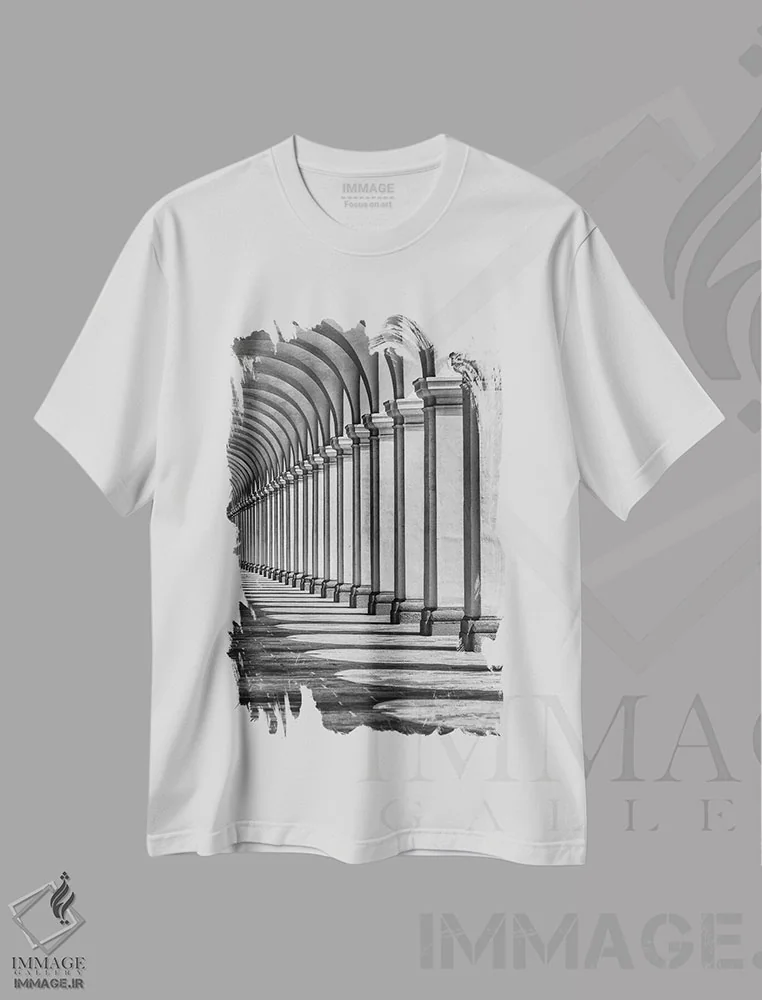تیشرت سفید طرح دار ستون ها، ریتم، عکاسی سیاه و سفید اثر میکولاج گوسپودرک | فروشگاه ایماژ تیشرت طرح دار ستون ها، ریتم اثر میکولاج گوسپودرک