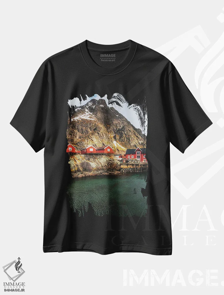 تیشرت مشکی طرح دار آثار میکولاج گوسپودرک - immage.ir تیشرت طرح دار Lofoten In Norway,کلبه های ماهیگیران، لوفوتن در نروژ اثر میکولاج گوسپودرک
