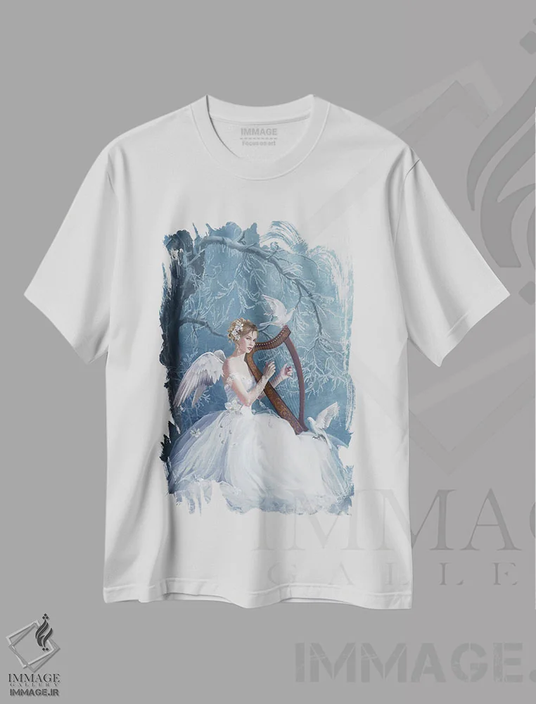 تیشرت سفید طرح دار کر آگنه با چنگ و کبوتر، هنر دیجیتال اثر نه نه توماس | فروشگاه ایماژ تیشرت طرح دار کر آگنه با چنگ و کبوتر اثر نه نه توماس