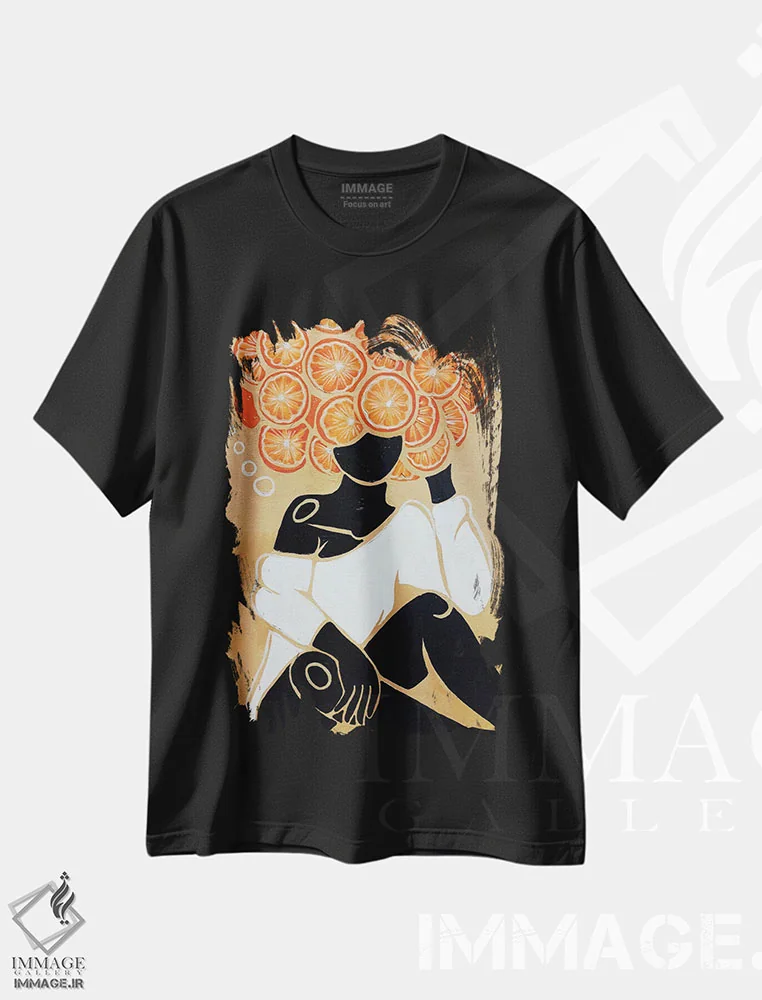 تیشرت مشکی طرح دار نارنگی، هنر آمریکایی آفریقایی تبار اثر نیدیا دراز | فروشگاه ایماژ تیشرت طرح دار نارنگی اثر نیدیا دراز