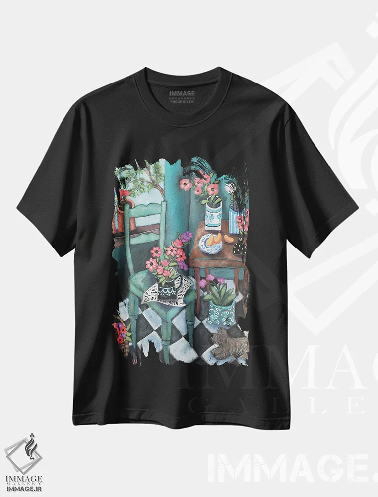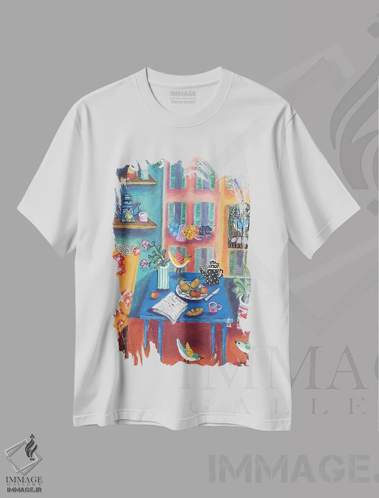 تیشرت سفید طرح دار اتاق باغی آفتابی، تزئینی اثر هالی وُجاهن | فروشگاه ایماژ تیشرت طرح دار اتاق باغی آفتابی اثر هالی وُجاهن