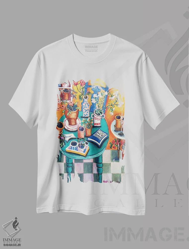 تیشرت سفید طرح دار میز سبز، هنر فاخر معاصر اثر هالی وُجاهن | فروشگاه ایماژ تیشرت طرح دار میز سبز اثر هالی وُجاهن