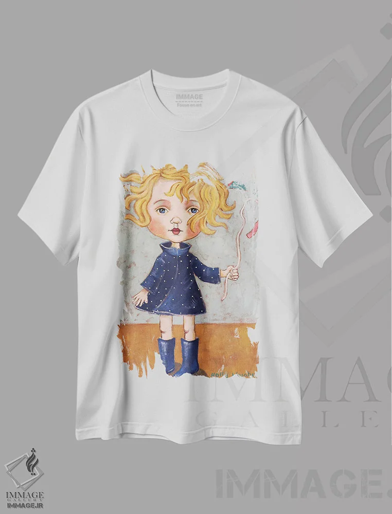 تیشرت سفید طرح دار بادی با چکمه های بارانی، هنر فاخر معاصر اثر هالی وُجاهن | فروشگاه ایماژ تیشرت طرح دار بادی با چکمه های بارانی اثر هالی وُجاهن