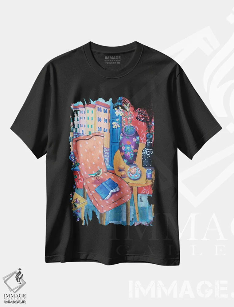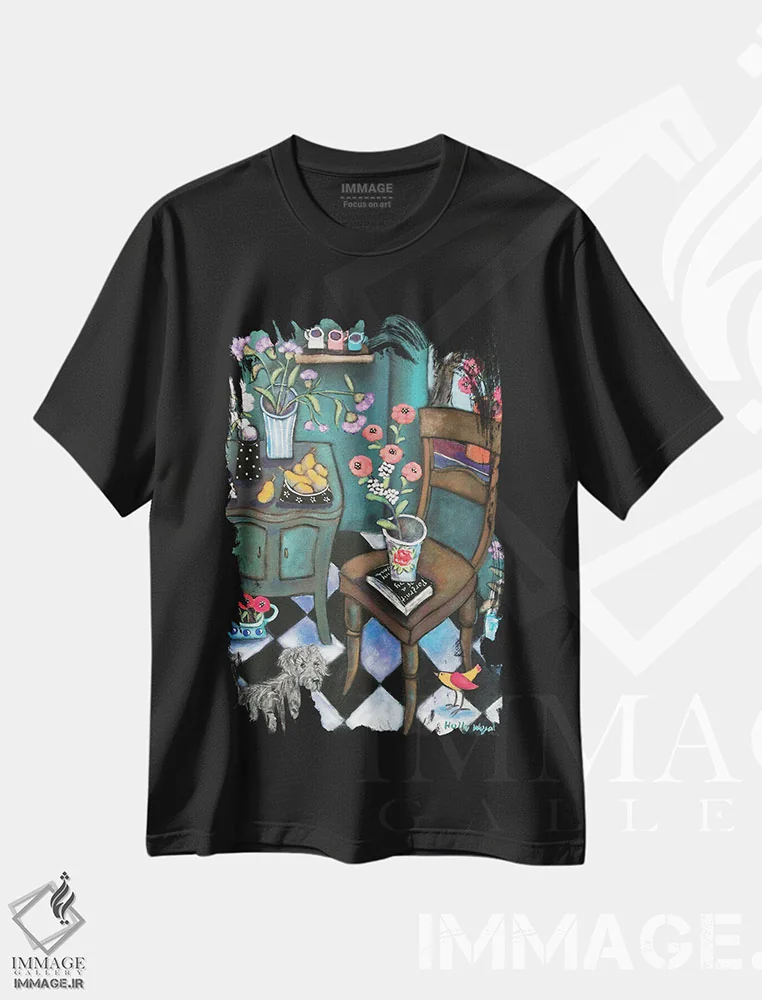 تیشرت مشکی طرح دار سالن رنگارنگ، هنر فاخر معاصر اثر هالی وُجاهن | فروشگاه ایماژ تیشرت طرح دار سالن رنگارنگ اثر هالی وُجاهن
