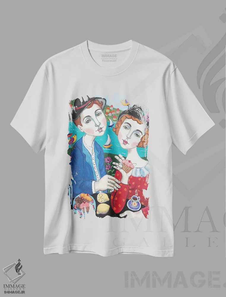 تیشرت سفید طرح دار زوج همراه کیک ها، تزئینی اثر هالی وُجاهن | فروشگاه ایماژ تیشرت طرح دار زوج همراه کیک ها اثر هالی وُجاهن