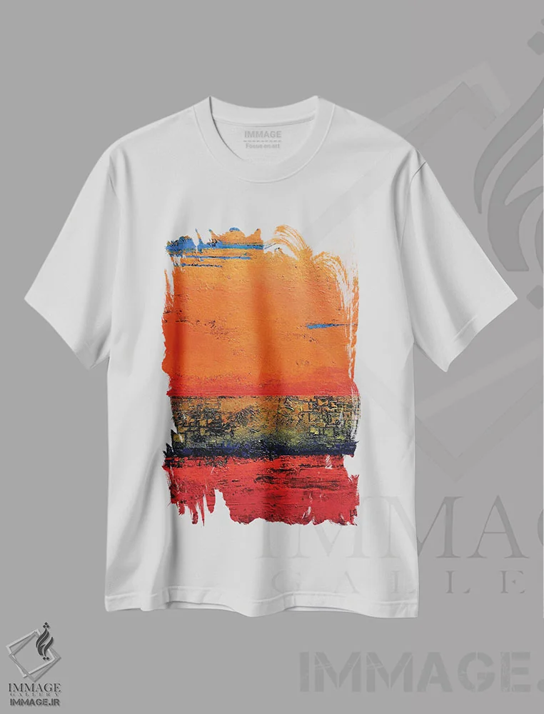 تیشرت سفید طرح دار قرمز، نارنجی و آبی اثر هانک پره بوم | فروشگاه ایماژ