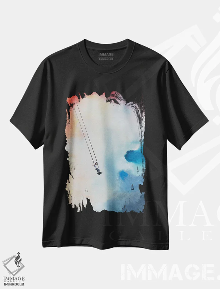 تیشرت مشکی طرح دار دختر روی تاب، دکور معاصر اثر هانک پره بوم | فروشگاه ایماژ