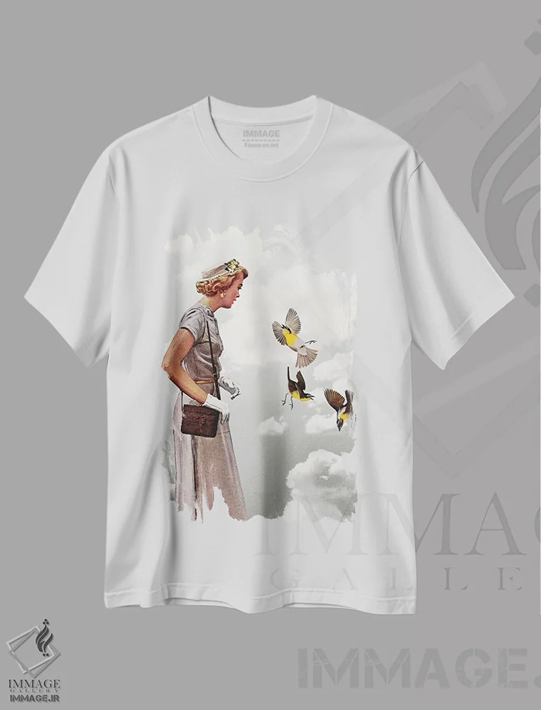 تیشرت سفید طرح دار پرنده، دکوراسیون جایگزین اثر هدر لندیس | فروشگاه ایماژ