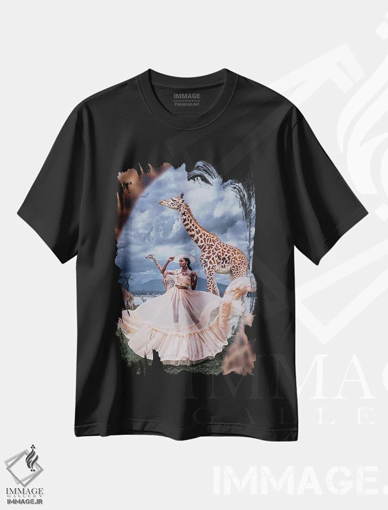 تیشرت مشکی طرح دار – تیشرت هنری ,"زیبای کنیا میان شترمرغ ها راه می رود" اثر هوبوپیبا فروشگاه ایماژ تیشرت طرح هنری ,"زیبای کنیا میان شترمرغ ها راه می رود" اثر هوبوپیبا