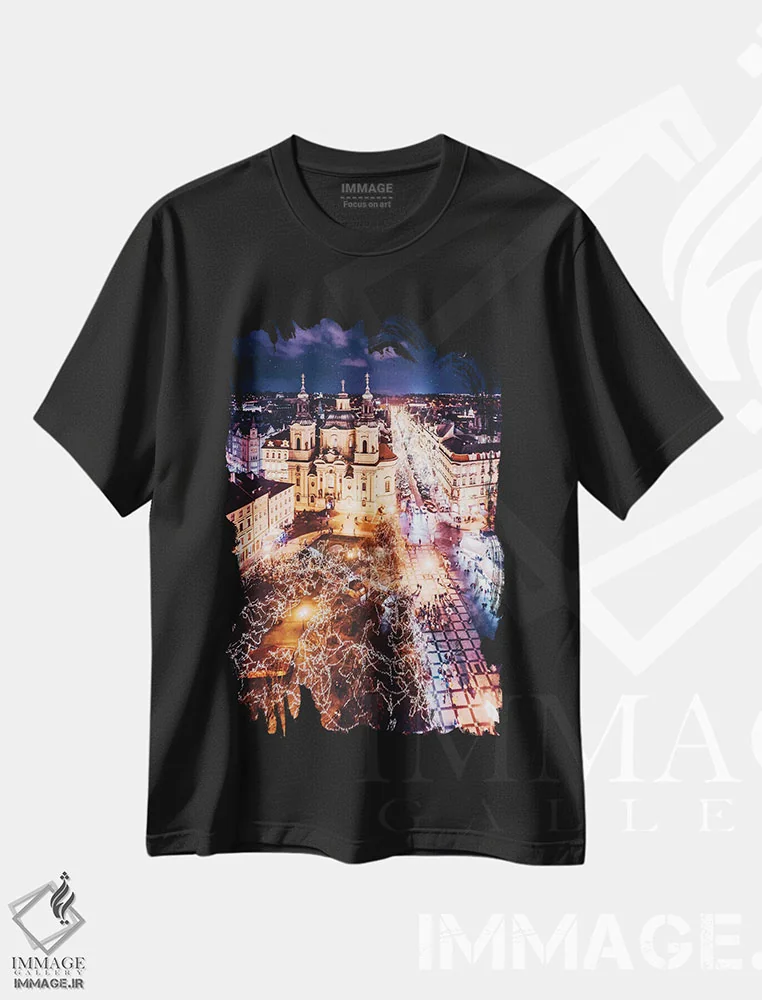 تیشرت مشکی طرح دار – تیشرت شهری ,"پراگ مه آلود و جادویی" اثر هوبوپیبا فروشگاه ایماژ تیشرت طرح شهری ,"پراگ مه آلود و جادویی" اثر هوبوپیبا