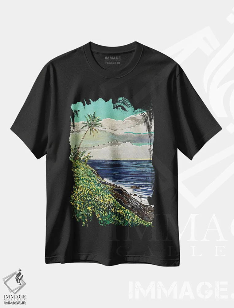 تیشرت مشکی طرح دار دو نخل در ساحل، دکور ساحلی اثر هیدن هیل | فروشگاه ایماژ تیشرت طرح دار دو نخل در ساحل اثر هیدن هیل