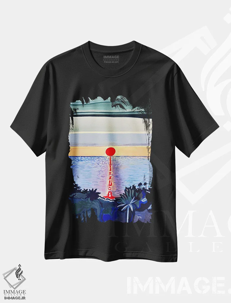 تیشرت مشکی طرح دار خورشید سرخ بر فراز دریای آرام، تزئینی اثر هیدن هیل | فروشگاه ایماژ تیشرت طرح دار خورشید سرخ بر فراز دریای آرام اثر هیدن هیل