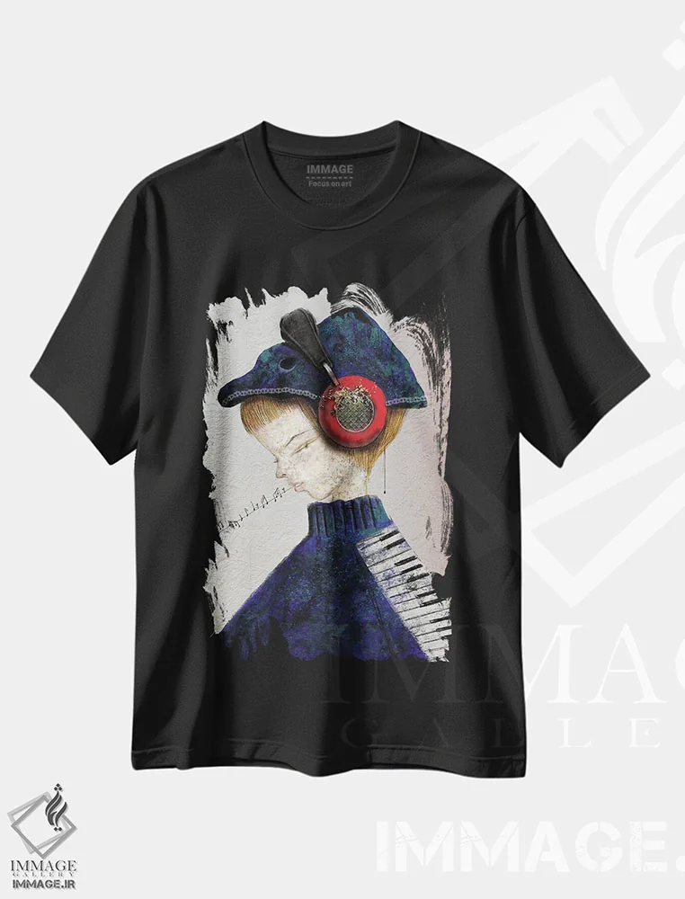 تیشرت مشکی طرح دار موسیقی نیلی، دکوراسیون جایگزین اثر هیرویوشی کوراوا | فروشگاه ایماژ