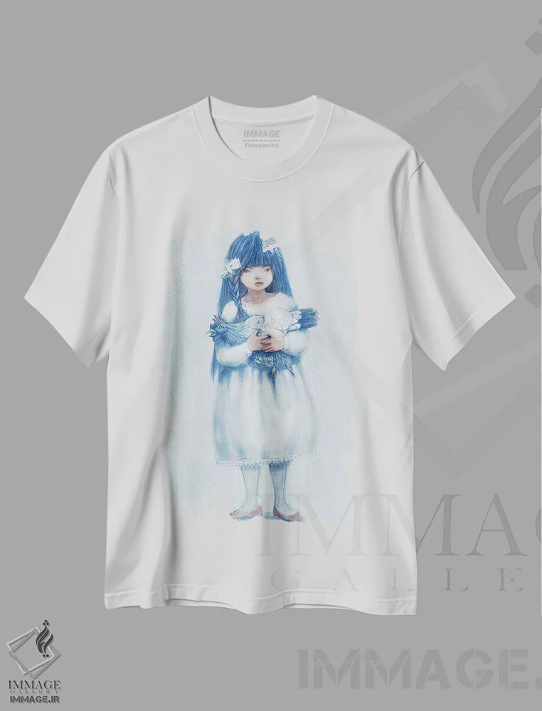 تیشرت سفید طرح دار مرغ نیلی، دکوراسیون جایگزین اثر هیرویوشی کوراوا | فروشگاه ایماژ