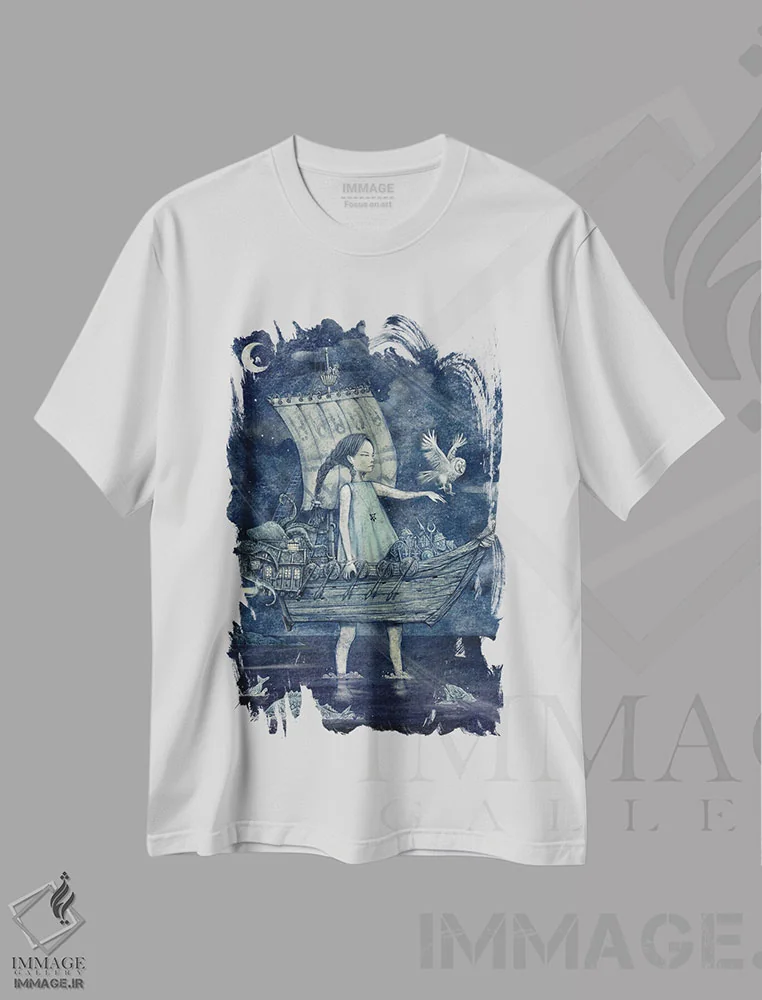تیشرت سفید طرح دار کشتی شبانه نیلی، دکوراسیون جایگزین اثر هیرویوشی کوراوا | فروشگاه ایماژ