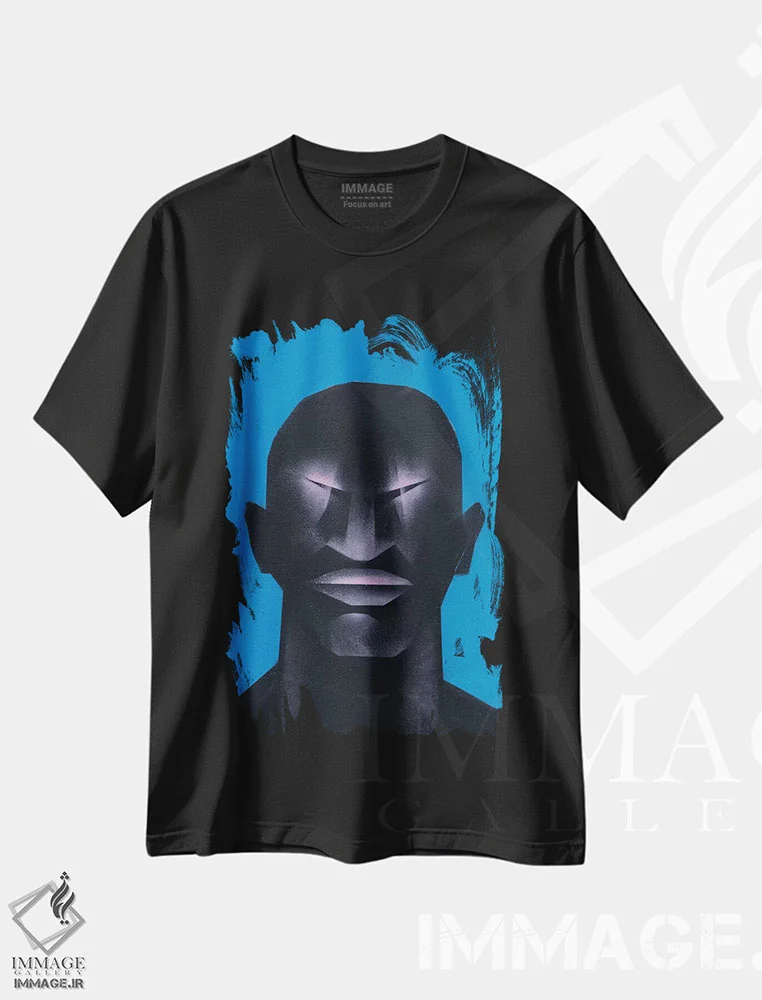 تیشرت مشکی طرح دار پرتره در آبی، هنر آمریکایی آفریقایی تبار اثر وی کالونتو | فروشگاه ایماژ