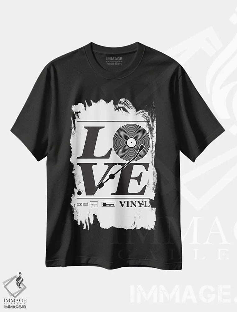 تیشرت مشکی طرح دار عاشق صفحه گرامافون، هنر تزئینی سیاه و سفید اثر پرینت های بنتون پارک | فروشگاه ایماژ تیشرت طرح دار عاشق صفحه گرامافون اثر پرینت های بنتون پارک
