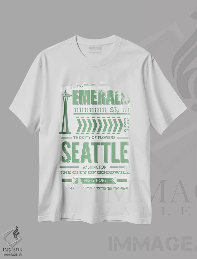 تیشرت سفید طرح دار تایپوگرافی سیاتل، هنر دیجیتال اثر پرینت های بنتون پارک | فروشگاه ایماژ تیشرت طرح دار تایپوگرافی سیاتل اثر پرینت های بنتون پارک