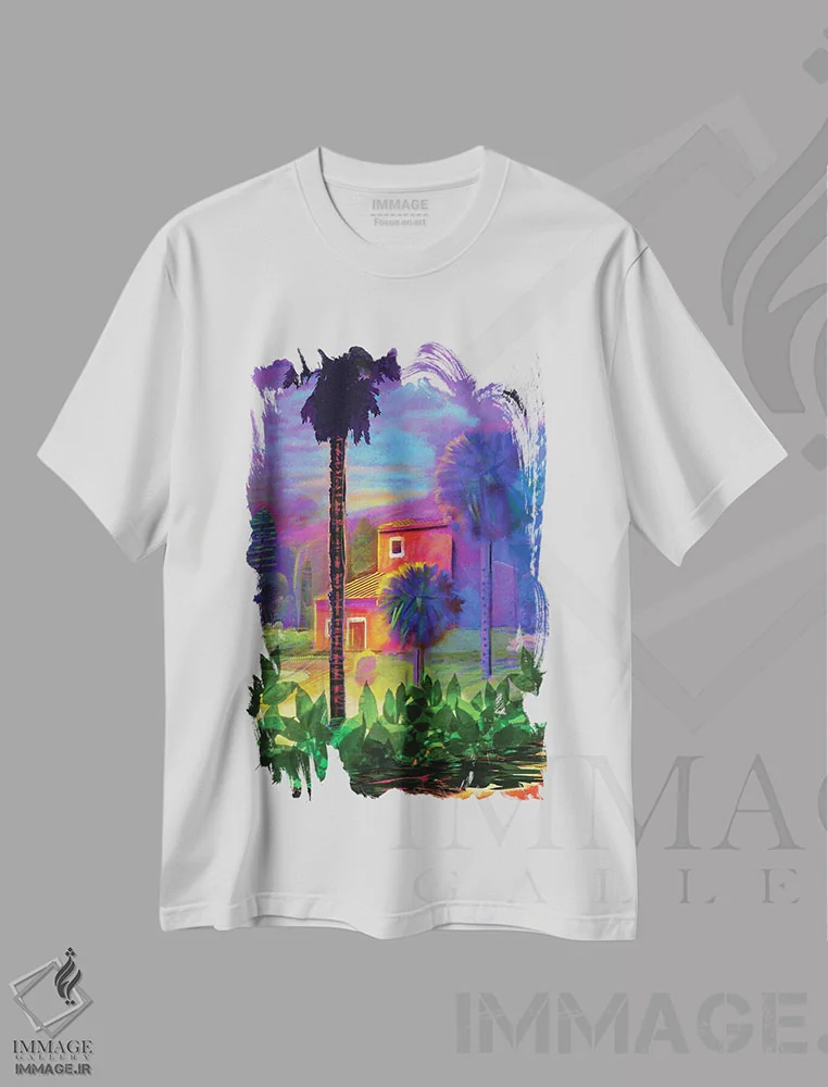 تیشرت سفید طرح دار تپه های پاسادنا، هنر فاخر معاصر اثر چارلز هارکر | فروشگاه ایماژ