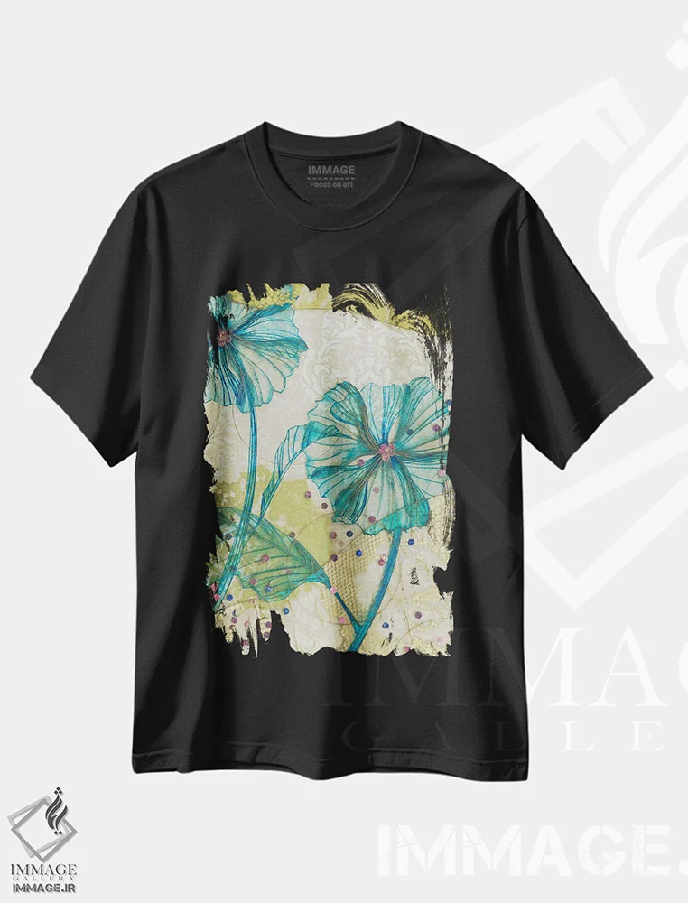 تیشرت مشکی طرح دار گل آبی، دکور معاصر اثر کارن سیکیه | فروشگاه ایماژ