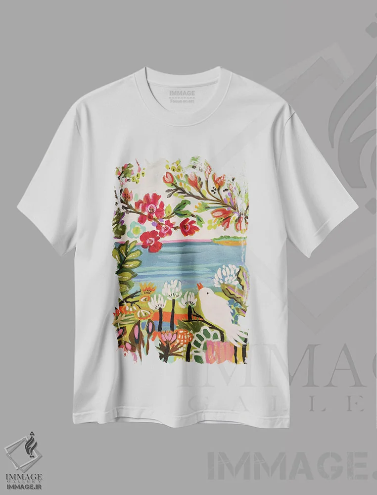 تیشرت سفید طرح دار پرندگان باغ ۱، دکور بوهمی اثر کارن فیلدز | فروشگاه ایماژ