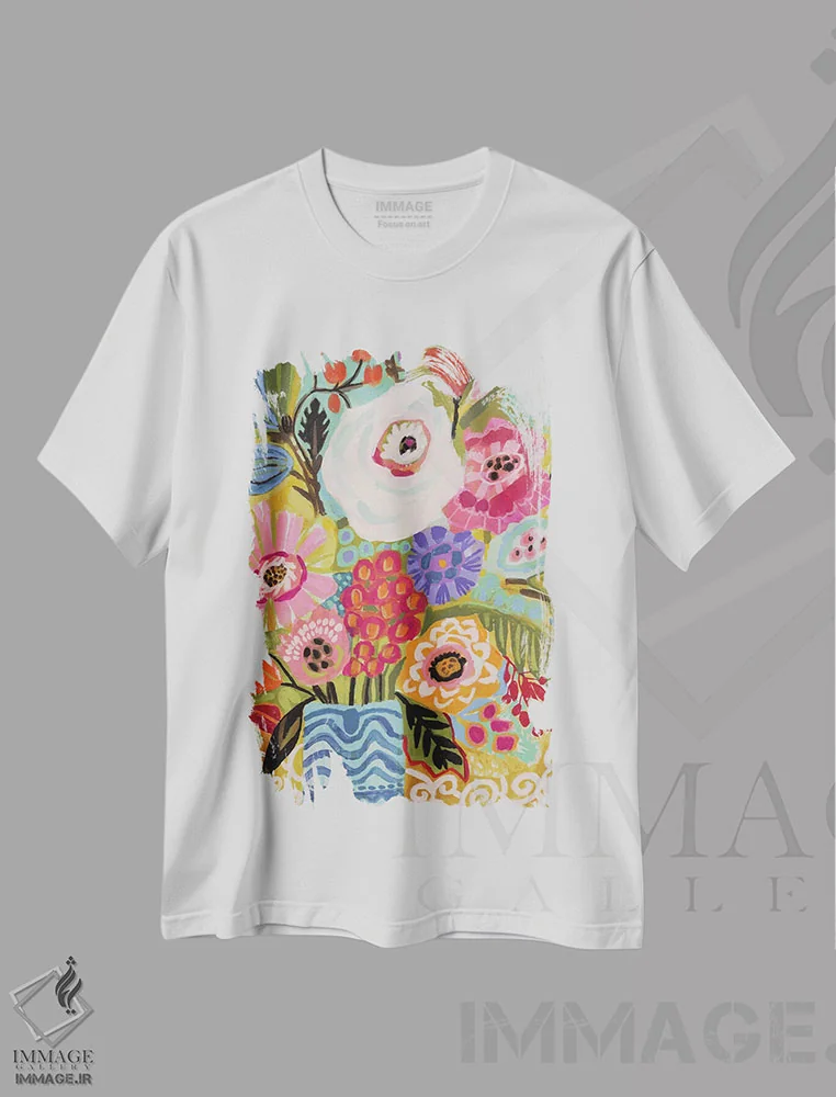 تیشرت سفید طرح دار گل های تابستانی در گلدان ۱، تزئینی اثر کارن فیلدز | فروشگاه ایماژ