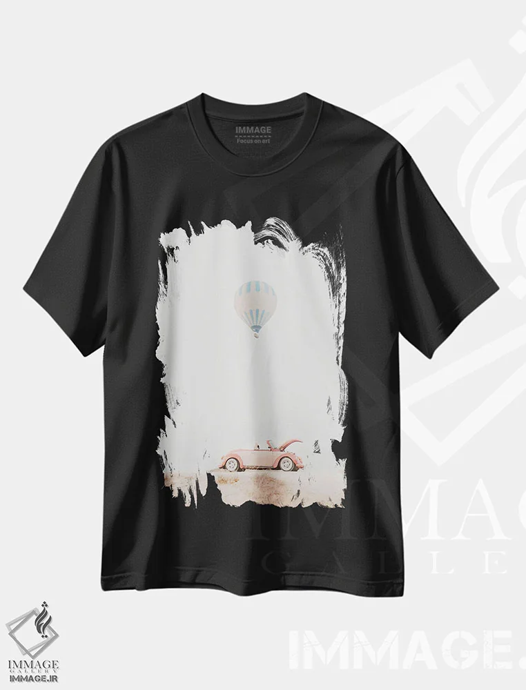 تیشرت مشکی طرح دار ماشین صورتی و بالون هوای گرم، تزئینی اثر کارن منداو | فروشگاه ایماژ تیشرت طرح دار ماشین صورتی و بالون هوای گرم اثر کارن منداو