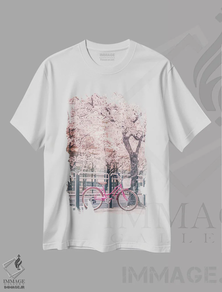 تیشرت سفید طرح دار دوچرخه صورتی زیر درختان گیلاس، مدیوم اثر کارن منداو | فروشگاه ایماژ تیشرت طرح دار دوچرخه صورتی زیر درختان گیلاس اثر کارن منداو