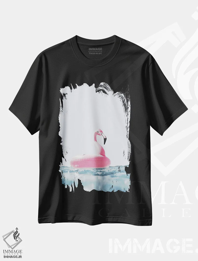 تیشرت مشکی طرح دار حلقه شنا فلامینگو صورتی، دکور ساحلی اثر کارن منداو | فروشگاه ایماژ تیشرت طرح دار حلقه شنا فلامینگو صورتی اثر کارن منداو