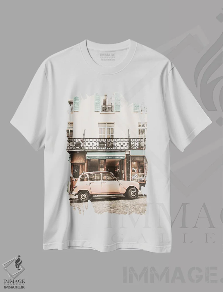 تیشرت سفید طرح دار ماشین صورتی در پاریس، مدیوم اثر کارن منداو | فروشگاه ایماژ تیشرت طرح دار ماشین صورتی در پاریس اثر کارن منداو