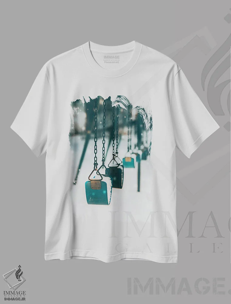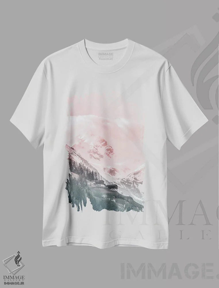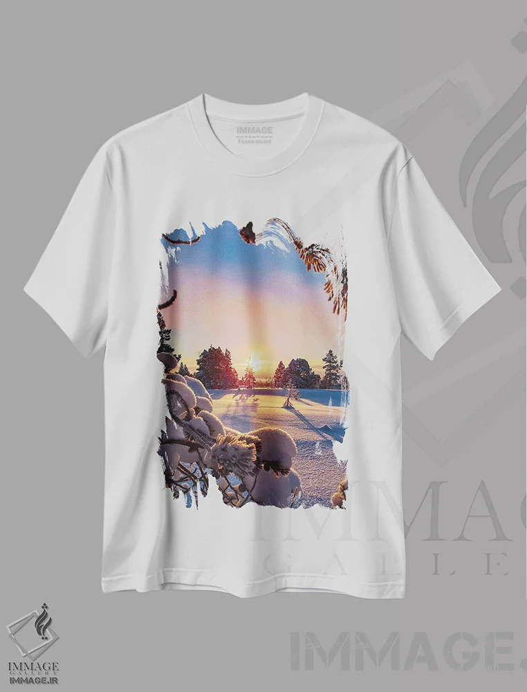 تیشرت سفید طرح دار چشم انداز برفی در غروب، مدیوم اثر کارن منداو | فروشگاه ایماژ تیشرت طرح دار چشم انداز برفی در غروب اثر کارن منداو