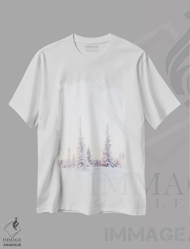 تیشرت سفید طرح دار پانورامای جنگل زمستانی III، دکور تعطیلات اثر کارن منداو | فروشگاه ایماژ تیشرت طرح دار پانورامای جنگل زمستانی III اثر کارن منداو