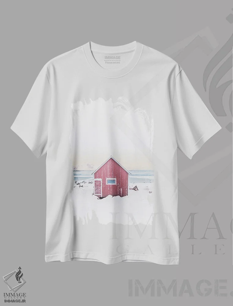 تیشرت سفید طرح دار کلبه کنار دریاچه قرمز، دکور تعطیلات اثر کارن منداو | فروشگاه ایماژ تیشرت طرح دار کلبه کنار دریاچه قرمز اثر کارن منداو