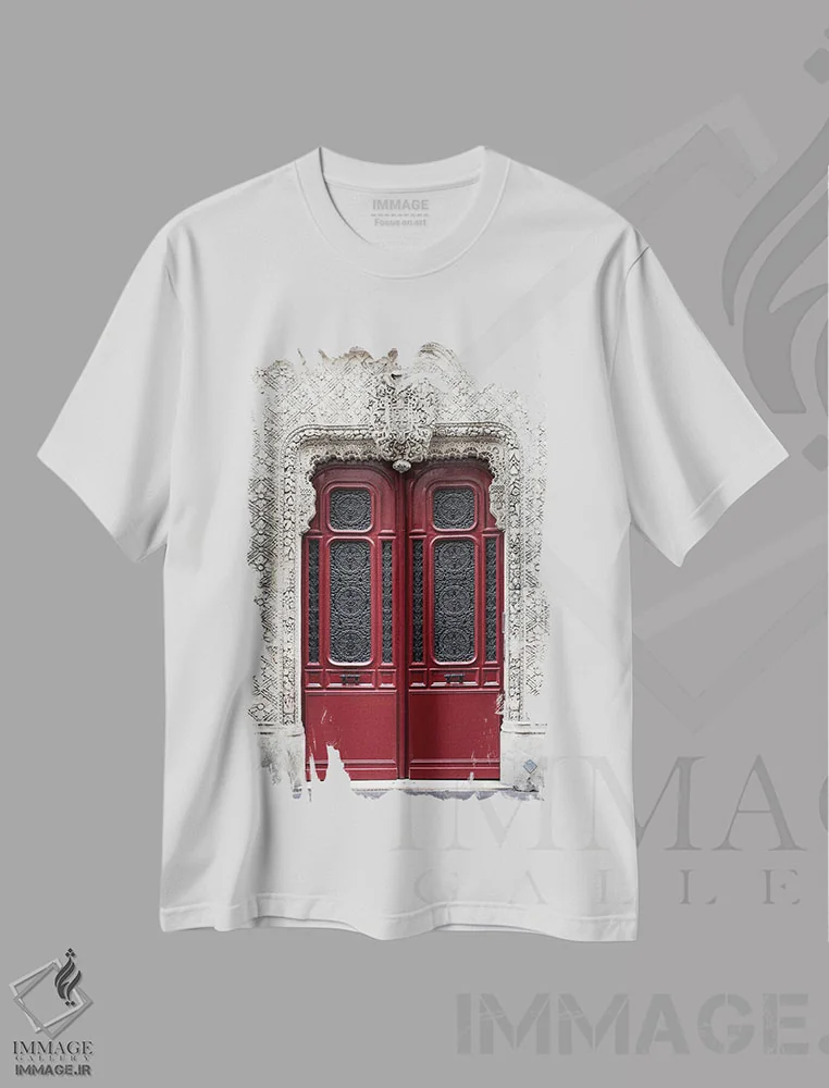 تیشرت سفید طرح دار درِ قرمز پاریسی، مدیوم اثر کارن منداو | فروشگاه ایماژ تیشرت طرح دار درِ قرمز پاریسی اثر کارن منداو