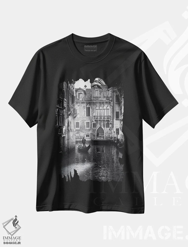 تیشرت مشکی طرح دار کانال ونیز با گوندولا سیاه و سفید، مدیوم اثر کارن منداو | فروشگاه ایماژ تیشرت طرح دار کانال ونیز با گوندولا سیاه و سفید اثر کارن منداو