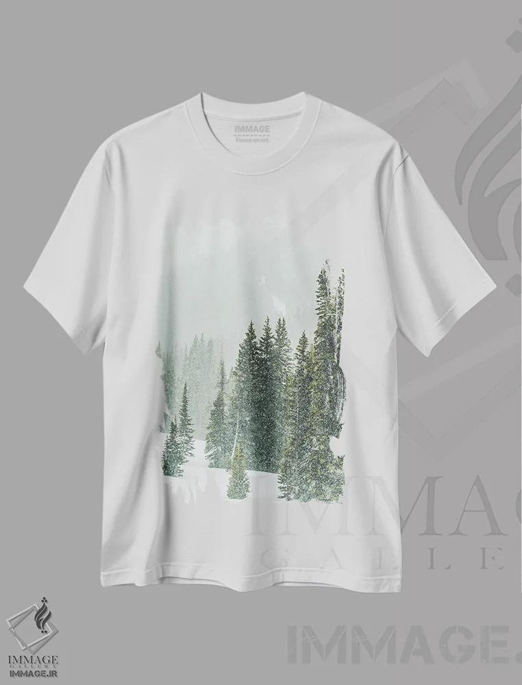 تیشرت سفید طرح دار پانورامای جنگل زمستانی I، دکور تعطیلات اثر کارن منداو | فروشگاه ایماژ تیشرت طرح دار پانورامای جنگل زمستانی I اثر کارن منداو