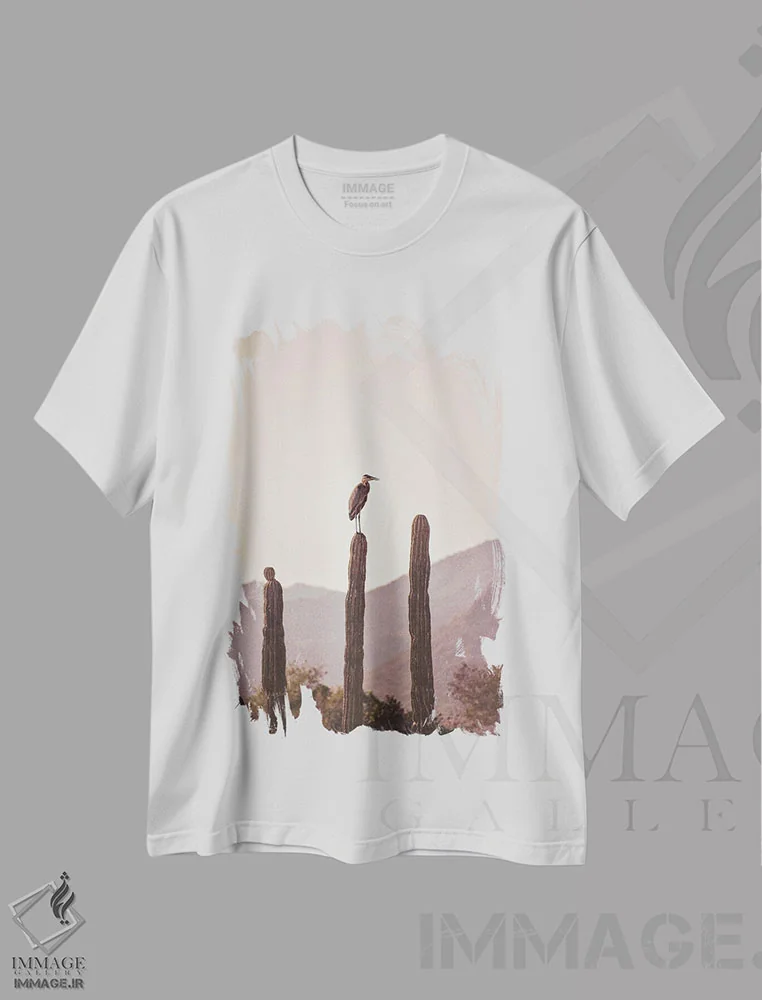تیشرت سفید طرح دار پرنده نشسته روی کاکتوس، مدیوم اثر کارن منداو | فروشگاه ایماژ تیشرت طرح دار پرنده نشسته روی کاکتوس اثر کارن منداو