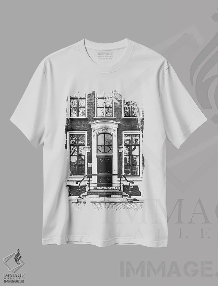تیشرت سفید طرح دار درب آمستردام، عکاسی سیاه و سفید اثر کارن منداو | فروشگاه ایماژ تیشرت طرح دار درب آمستردام اثر کارن منداو