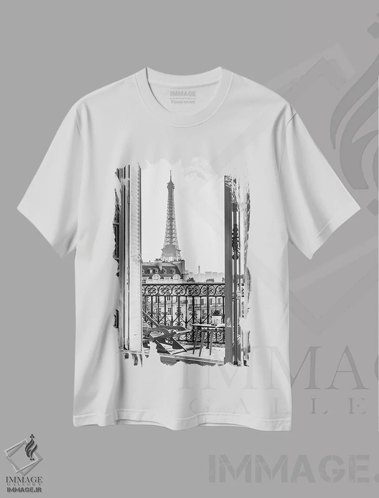 تیشرت سفید طرح دار نمای برج ایفل از بالکن پاریس، عکاسی سیاه و سفید اثر کارن منداو | فروشگاه ایماژ تیشرت طرح دار نمای برج ایفل از بالکن پاریس اثر کارن منداو