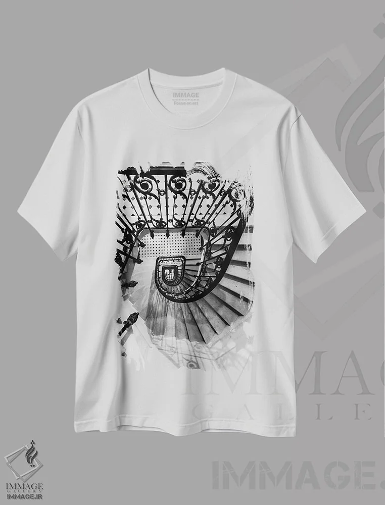تیشرت سفید طرح دار راه پله سیاه و سفید، مدیوم اثر کارن منداو | فروشگاه ایماژ تیشرت طرح دار راه پله سیاه و سفید اثر کارن منداو
