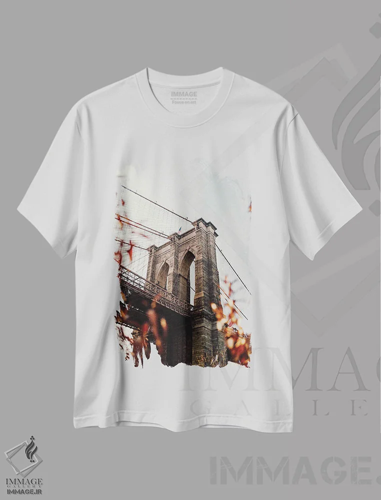 تیشرت سفید طرح دار پل بروکلین با برگ ها، مدیوم اثر کارن منداو | فروشگاه ایماژ تیشرت طرح دار پل بروکلین با برگ ها اثر کارن منداو