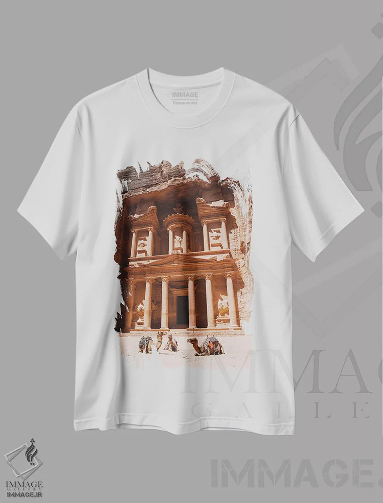 تیشرت سفید طرح دار شترها در پترا، اردن، مدیوم اثر کارن منداو | فروشگاه ایماژ تیشرت طرح دار شترها در پترا، اردن اثر کارن منداو