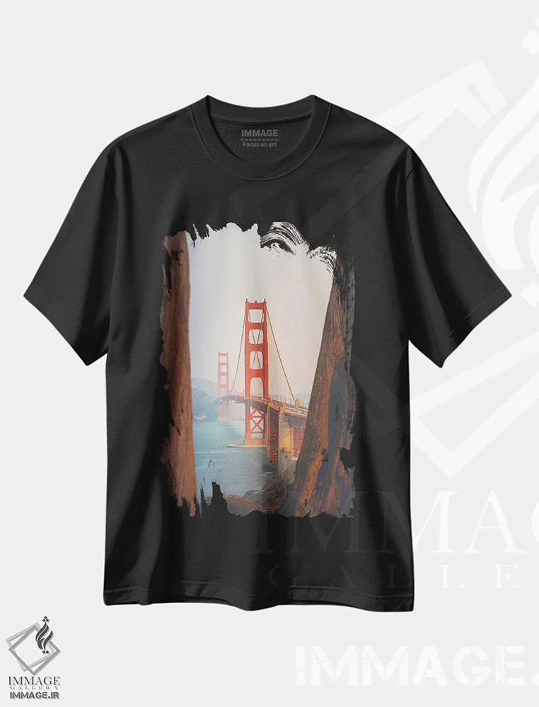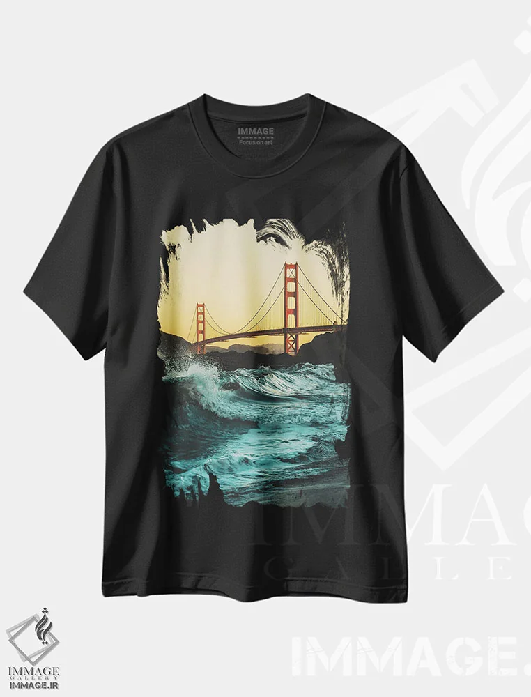 تیشرت مشکی طرح دار پل گلدن گیت با امواج، مدیوم اثر کارن منداو | فروشگاه ایماژ تیشرت طرح دار پل گلدن گیت با امواج اثر کارن منداو